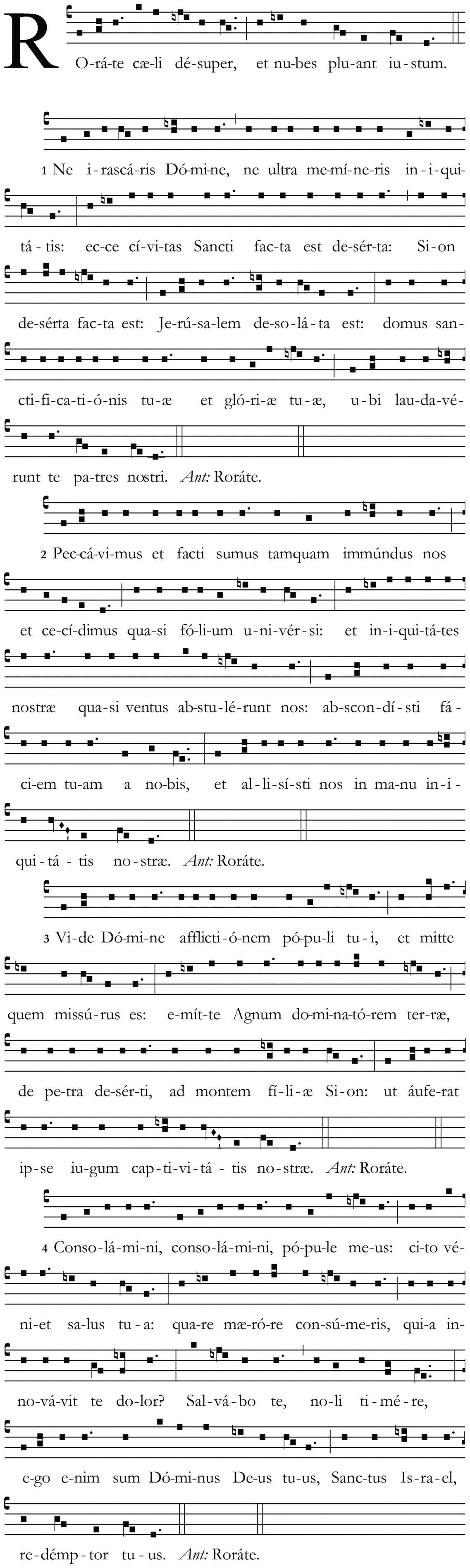 1 Ne irascaris Domine, ne ultra memineris iniquitatis: ecce civitas Sancti facta est deserta: Sion deserta facta est: Jerusalem desolata est: domus sanctificationis tuæ et gloriæ tuæ, ubi laudaverunt te patres nostri. Ant. Rorate.