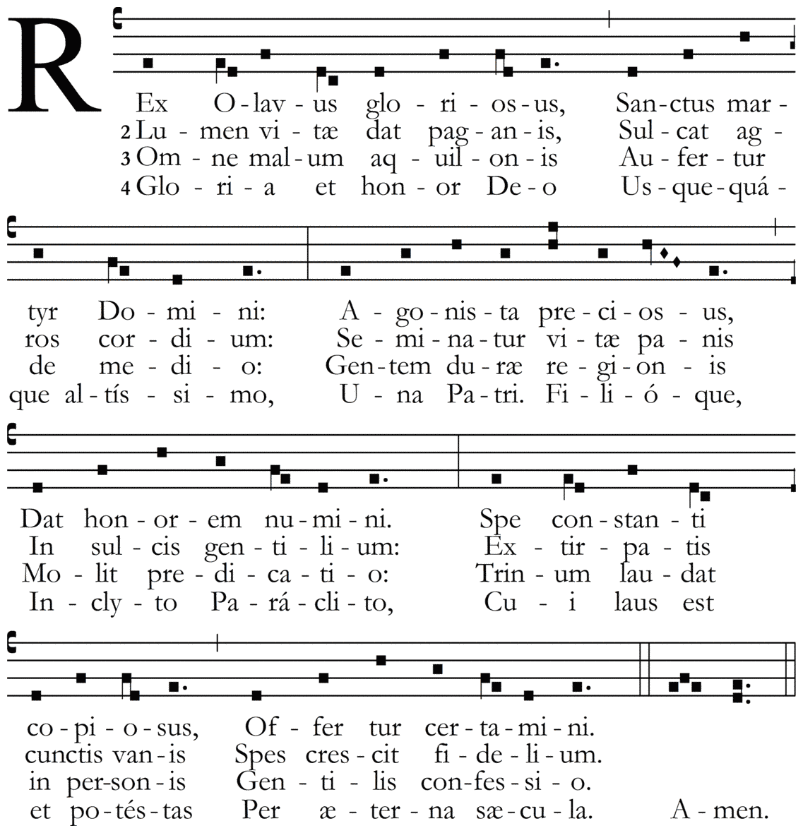 1 Rex Olavus gloriosus, Sanctus martyr Domini: Agonuata preciosus, Dat honorem numini. Spe constanti copiosus, Offer tur certamini.